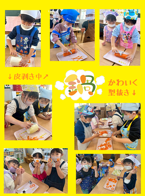大根と人参の皮を剥くのに、ピーラーにドキドキの子。使ったことあるよーなんて子もいました。