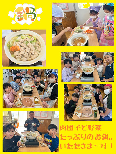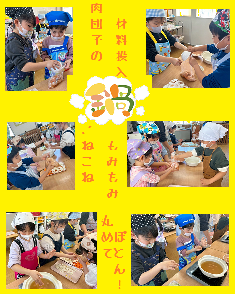 今日は年長組で鍋パーティー!今年も、子ども達が作りやすい肉団子の鍋にしました。