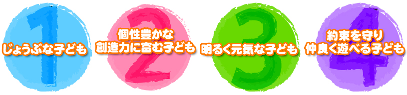 保育にあたっては、子供一人ひとりの個性を大事にし、愛と情熱をもって、たくましい人間形成の素地を育成するとともに、保護者や地域福祉と力を合わせ、児童の福祉を積極的に増進することに努めます。