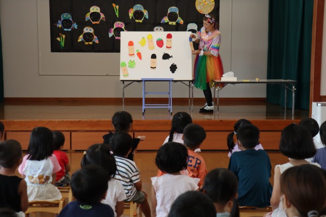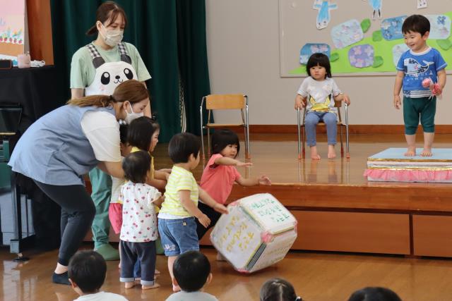 5月生まれ2名、6月生まれ5名の誕生者を祝いました(^^)/誕生者にとって特別な日☆ステージへ上がる前からワクワク(^^)/そんな誕生者への質問を決めるのに「何にしようかな~」と質問用のサイコロを転がす未満児さんの姿が可愛い(^^)/各クラスからはダンスの発表!!発表後「楽しかった~」と子ども達からの言葉(^^)/ステージ発表の経験を重ね自信が付き、楽しむ姿が見られていました(^^)/ 先生からの出し物は「お天気自動販売機」のパネルシアター!!次の日の天気を売っている自動販売機のお話に子ども達は夢中でした(^^)/