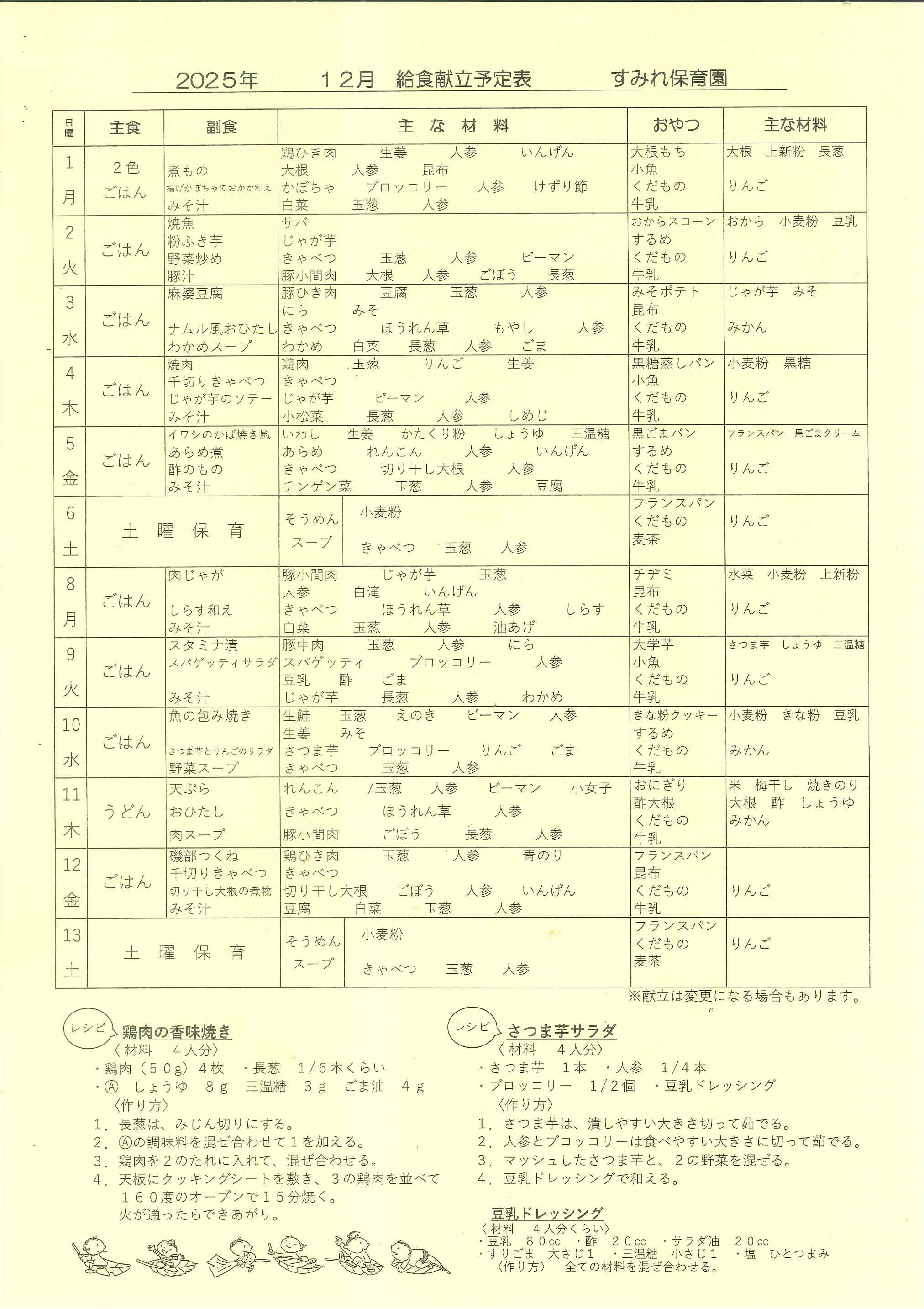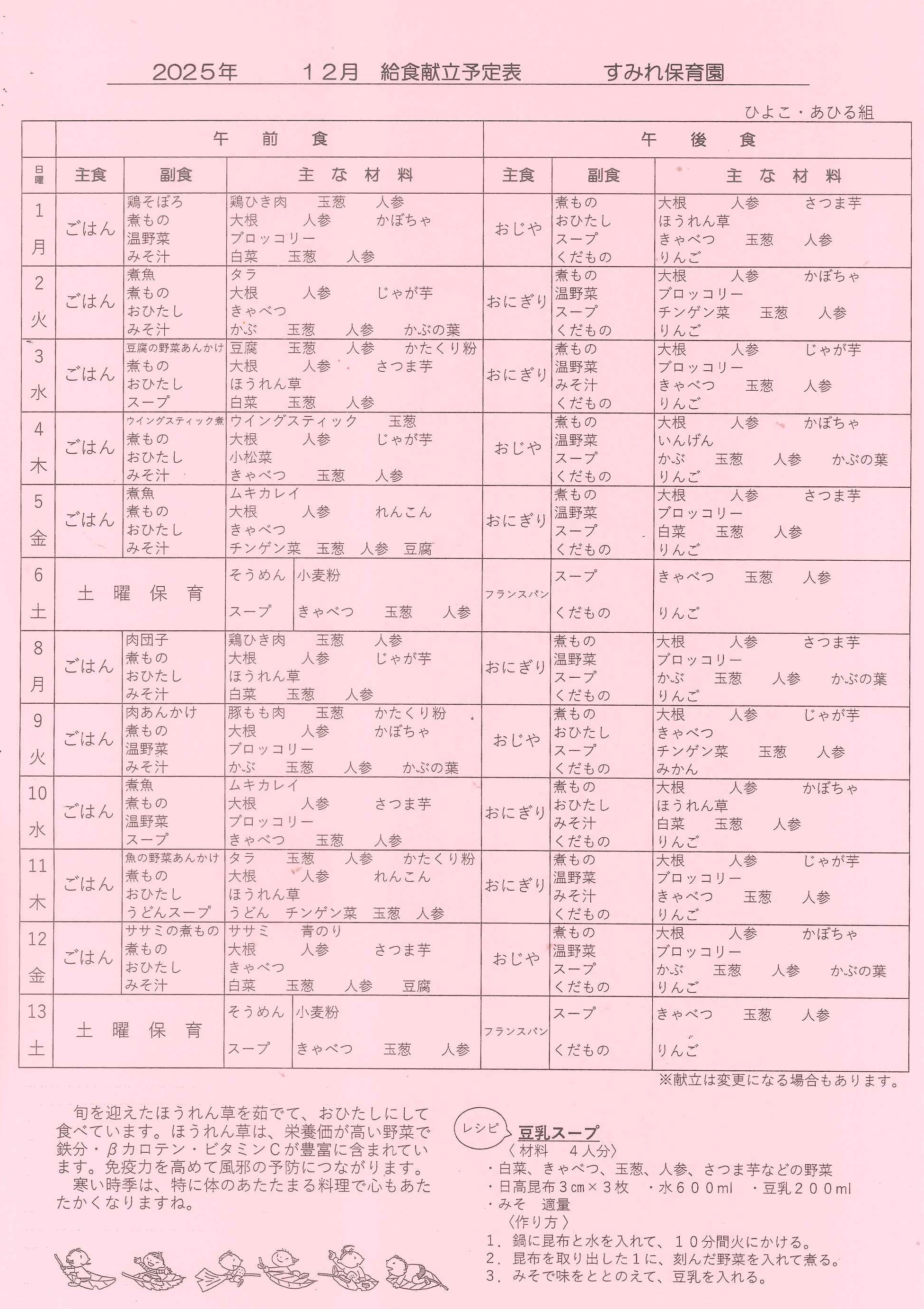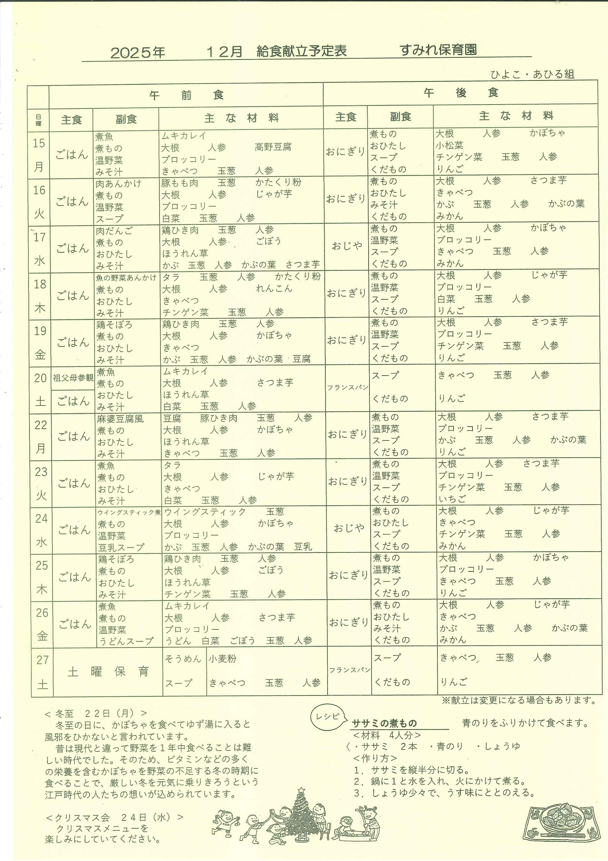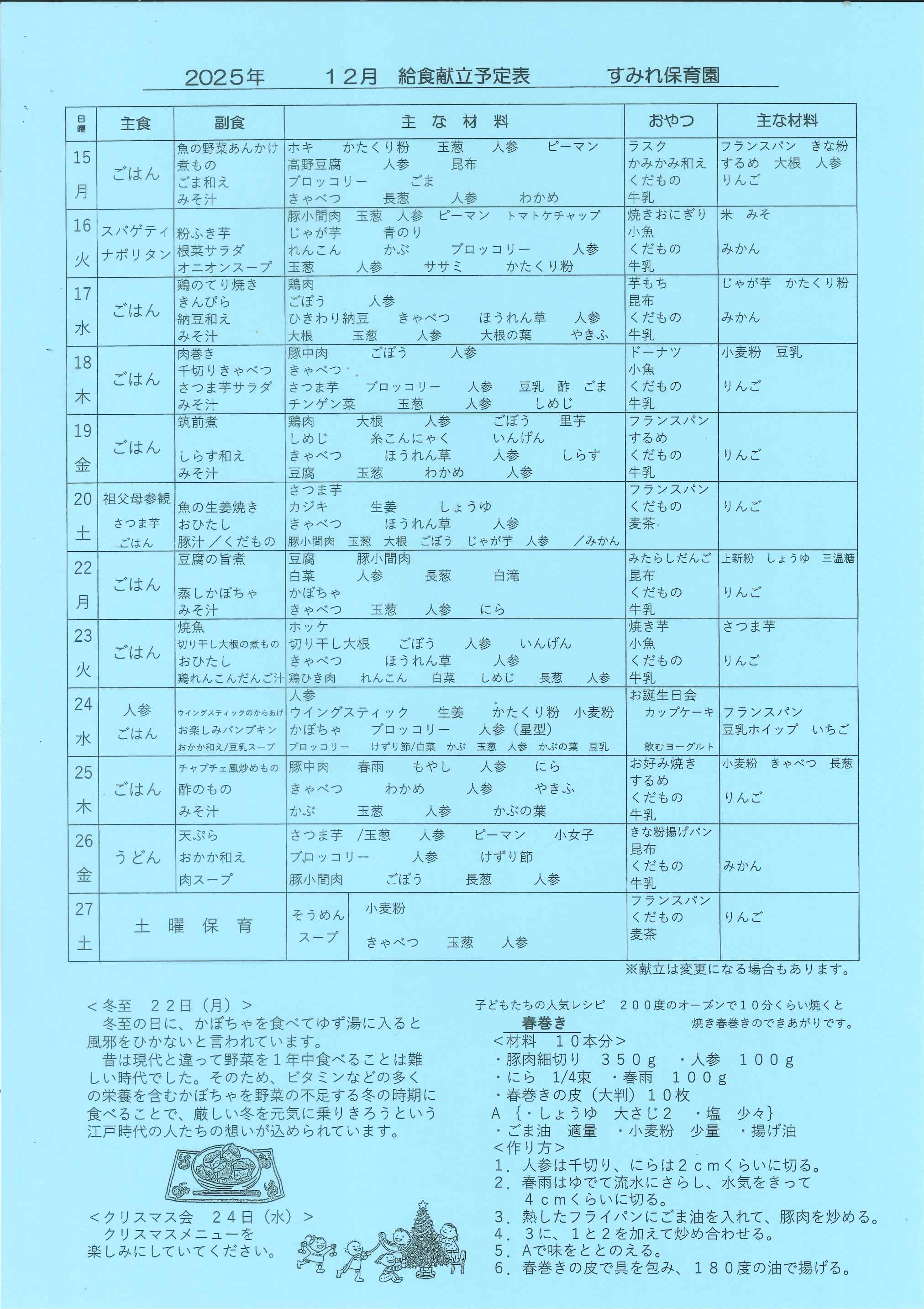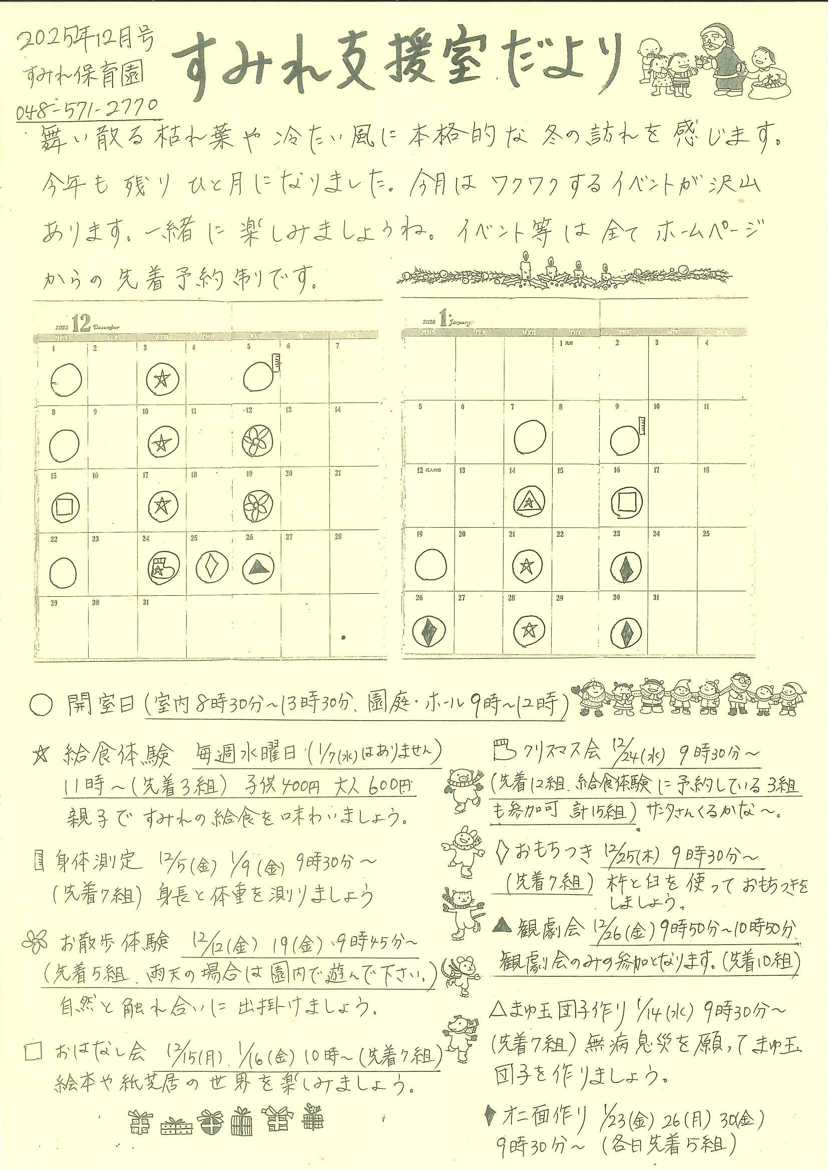 すみれ保育園子育て支援室だより・2025年12月号です。※すべての月・水・金曜日で予約がなくても、