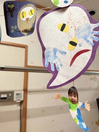 完成し、保育室に飾ると「○○ちゃんのおばけさーん」と言って
