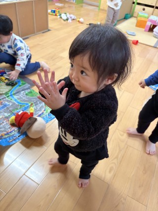 保育者の歌に合わせてマラカスを振るさくら組!シャカシャカといい音がするので楽しい様子♫歌が終わると「早く次の歌うたってよ」と言わんばかりにシャカシャカと振り続ける子もいれば、「きらきらひかるがいい」とリクエストする子もいましたよ。