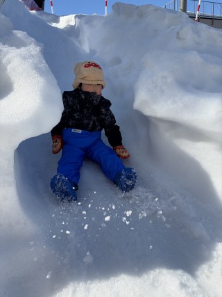 そして外に出ると「わぁ!」と目をキラキラさせて雪を触ったり、おままごとをしたり楽しんでいました。お姉さんたちの影響でソリやお尻滑りに挑戦する子もいましたよ✨