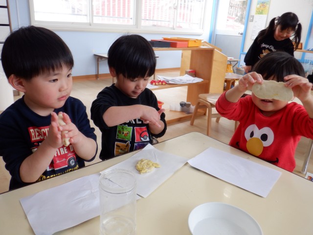 ミニひまわりの種を植えました!「なになに?」と興味津々なみんな。「綺麗に咲きますように」とお祈りをしました。