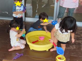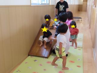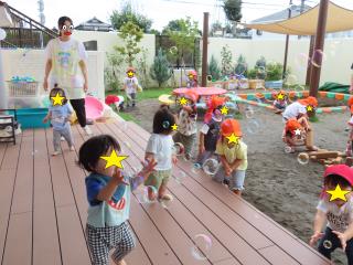 しゃぼん玉で遊びました。最初は0才児クラスがしゃぼん玉をしていると、それを見た1才児、2才児の園児たちもしゃぼん玉を追いかけたりしていました。とっても楽しそうでしたよ。
