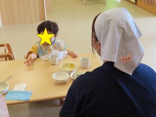 0才児クラスの食事の介助は担任保育士だけでなく栄養士も一緒に行なっています。離乳食の進み具合などを担任と共有し、それぞれの子に適した食事を提供しています。もちろん0才児クラスのみでなく、他のクラスにも食事の時間に回り、給食の食べ具合をチェックしたり、園児、職員に話を聞きながら日々、美味しい給食を作ってくれています。