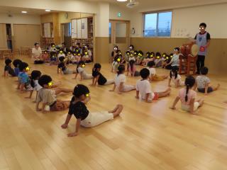 ホールで年長児クラスが運動会で行なう「組体操」の練習。在園児の2、4才児クラスの園児がそれを観に来ていました。まだまだ未完成ではありましたが、型が一つできるごとに観に来ていた園児たちから大きな拍手をもらっていました。