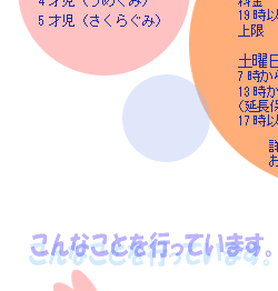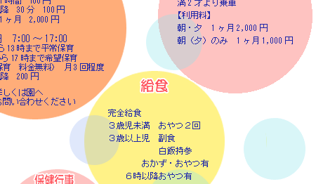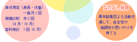 | 本園は児童福祉施設の精神に基づき、家庭との緊密な連携を保ちながら、乳幼児の養護と教育を実施し、次代を担う心身ともに健全な児童を育成することを目的とする。 |