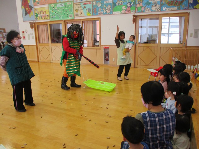 豆まき会では、鬼さんが持ってきたソリに