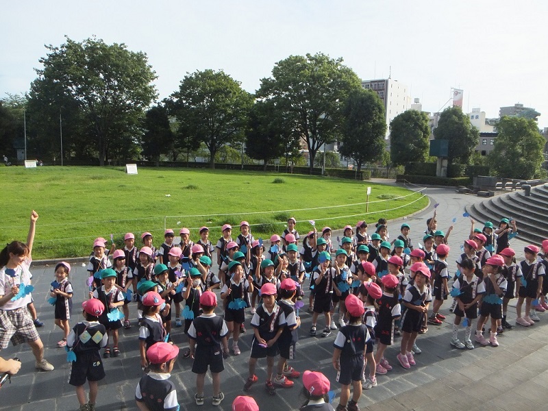 最近の生活環境はマンション生活が多くなり、家の近所では子供が自由に遊べる地面のある広場が少なくなっています。そうした環境の中で、幼稚園ではできるだけ多く園外に出て、緑の多い広い場所に行って伸び伸びと遊んだり、自然や動植物と触れ合い、いろいろな発見や経験ができるようにしています。