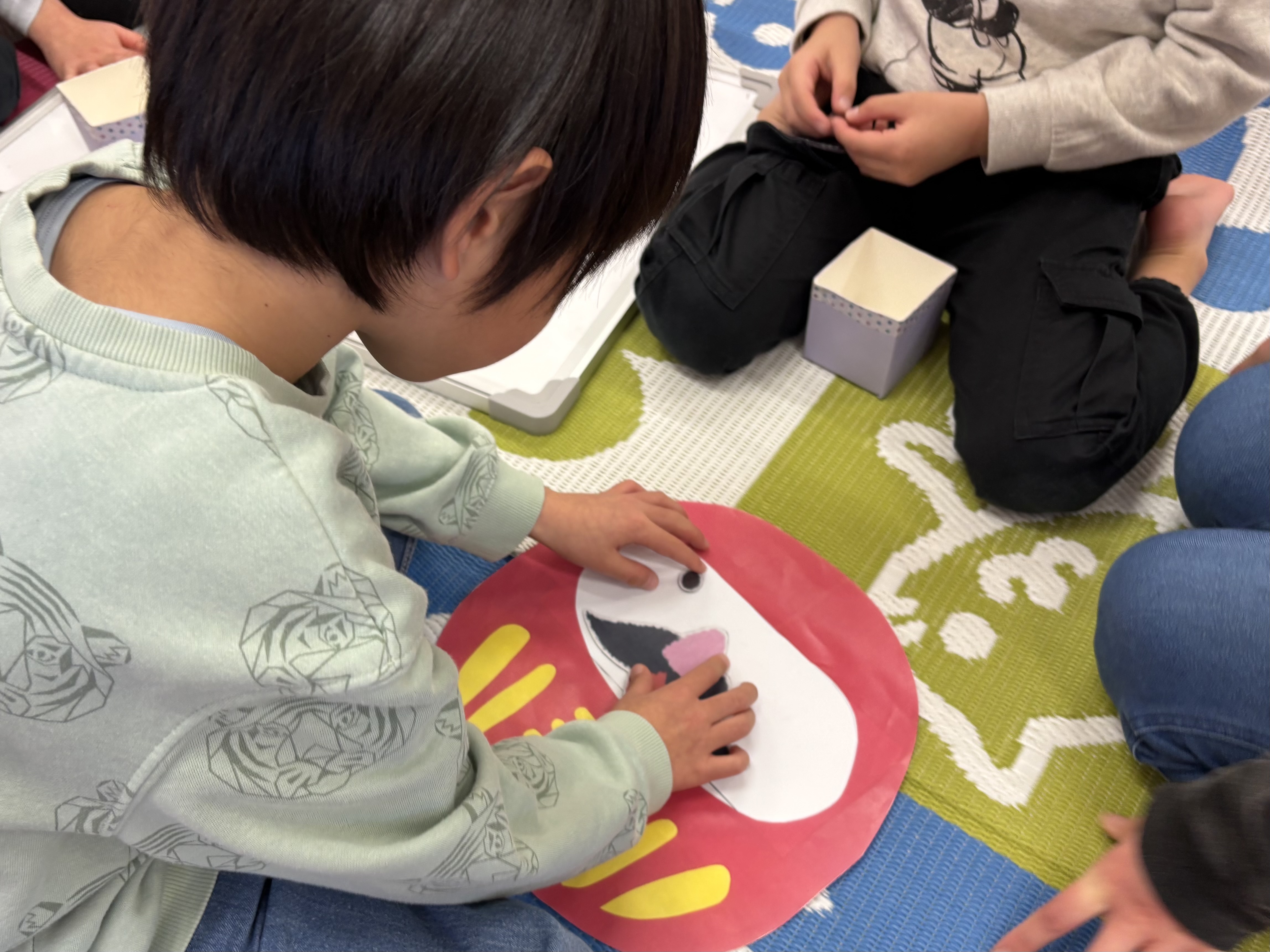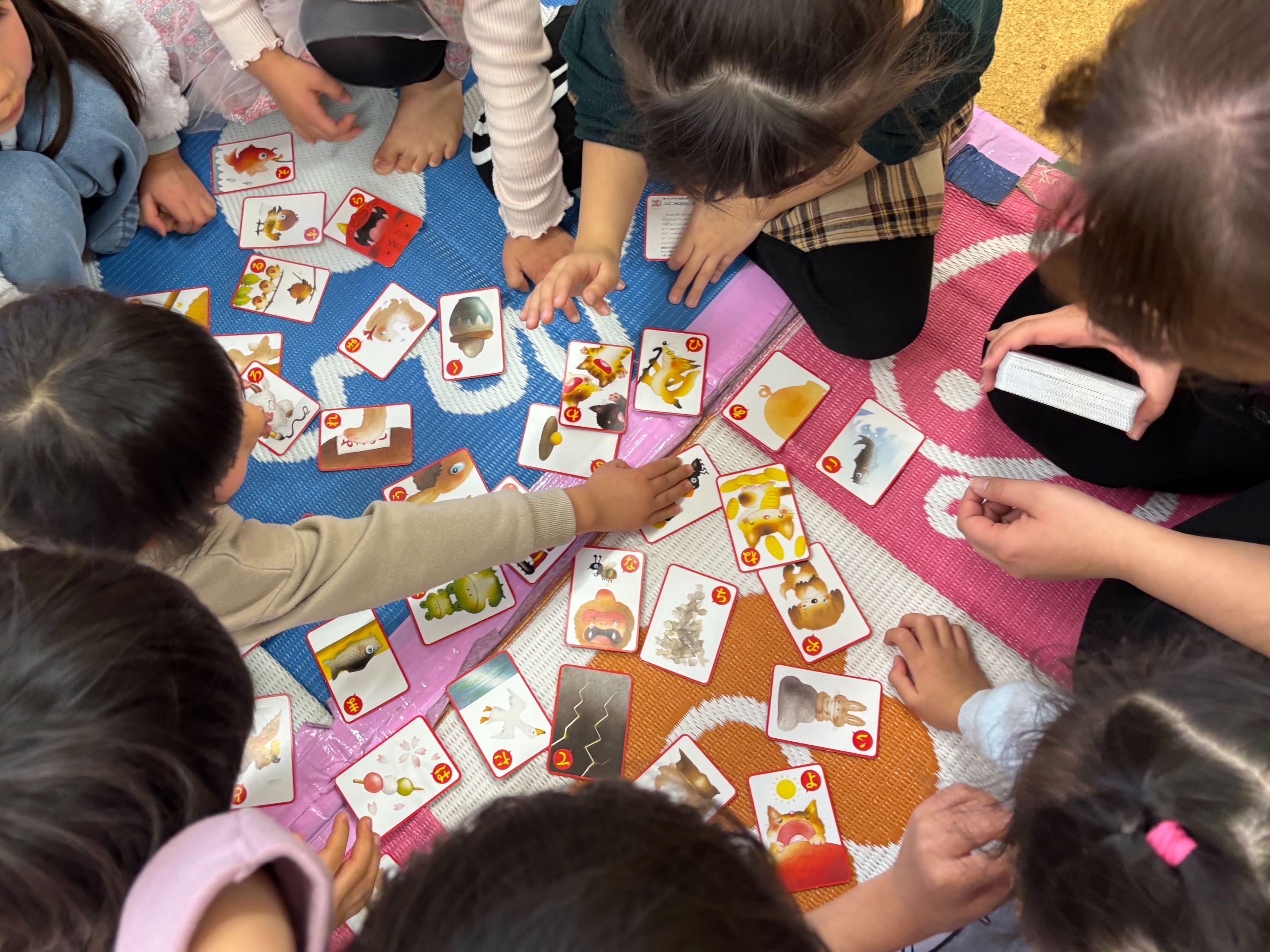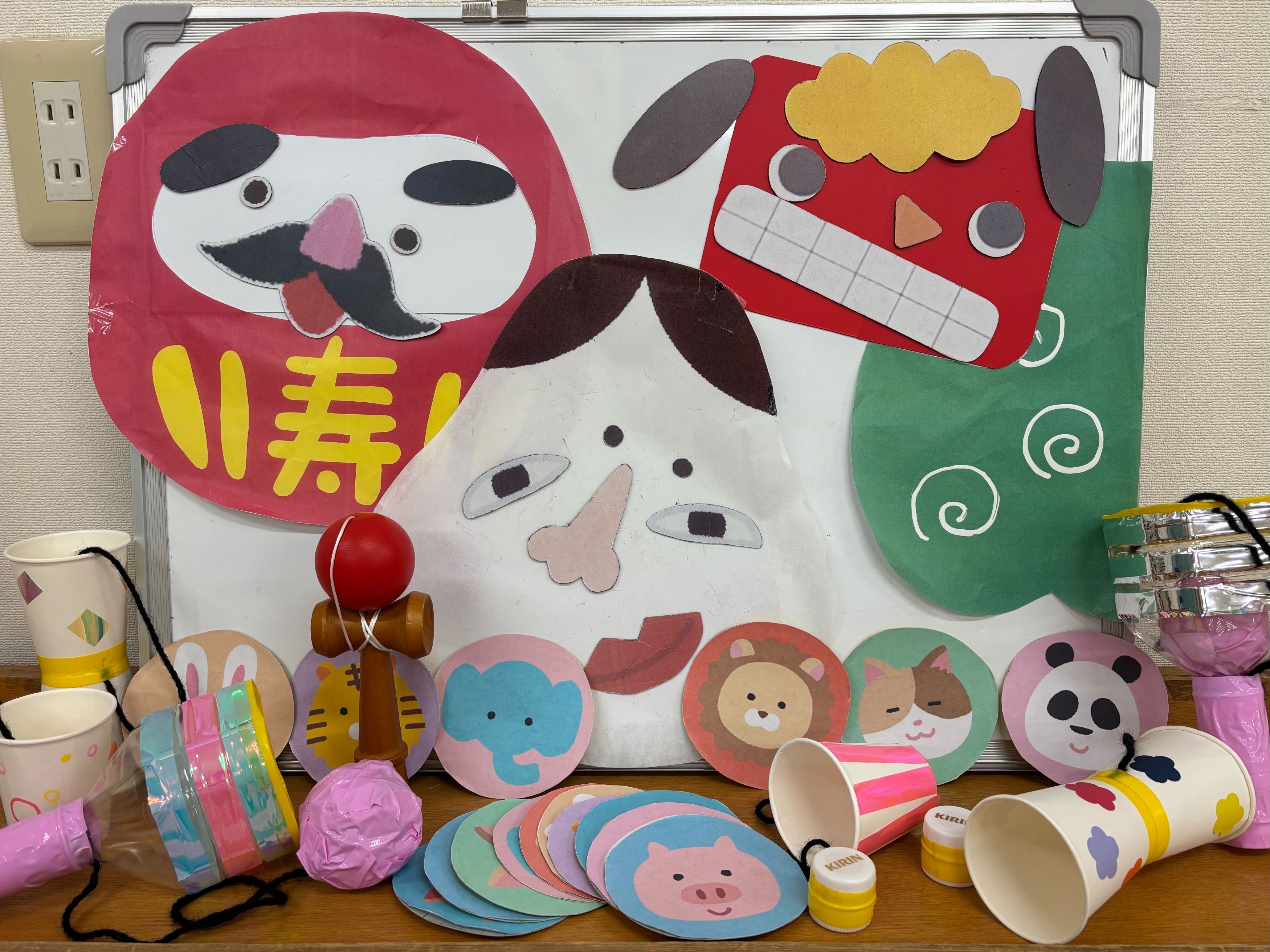 1月9日(金)にむかしあそび会を行いました。福笑い、けん玉、カルタと絵合わせカードを