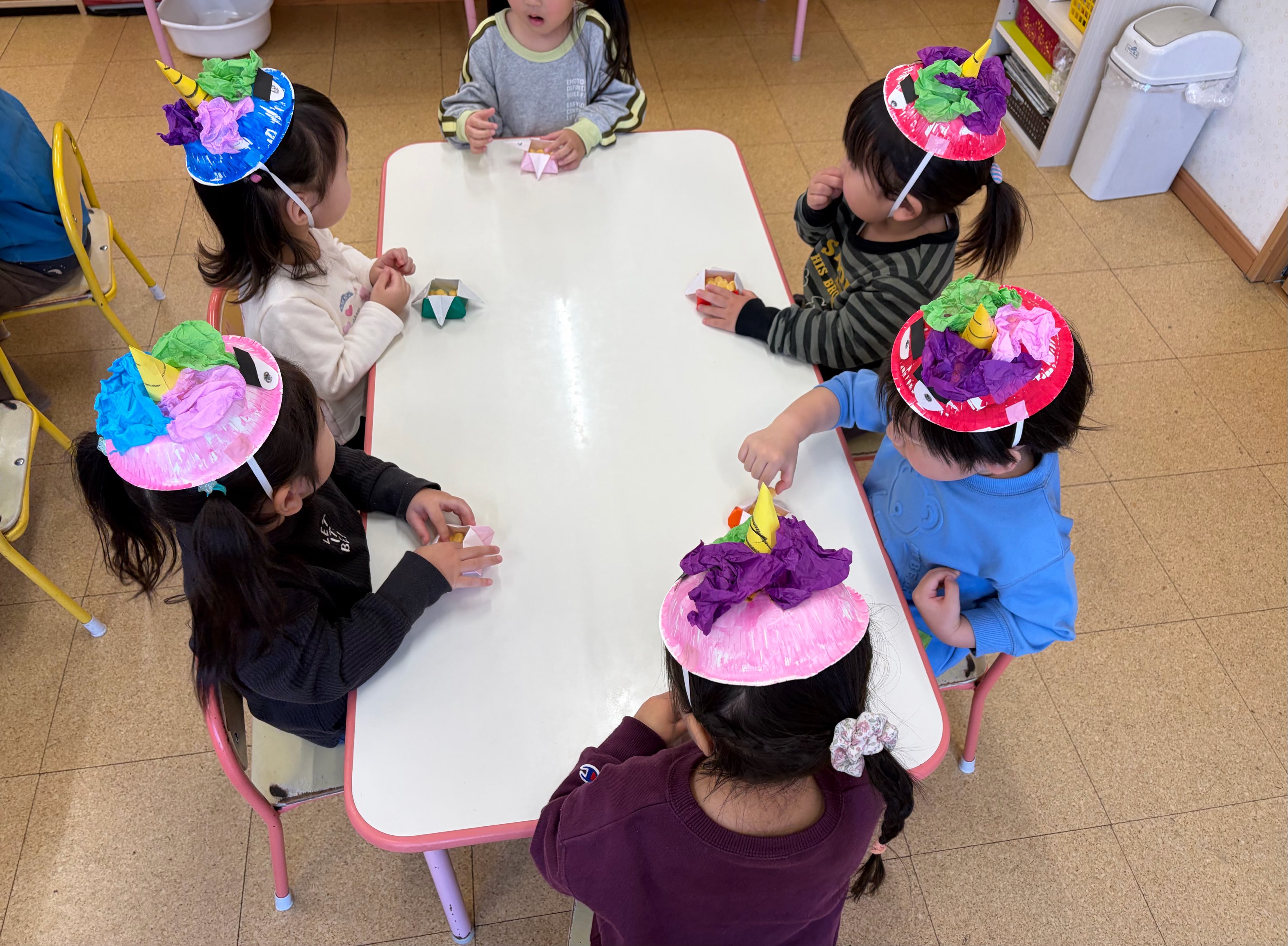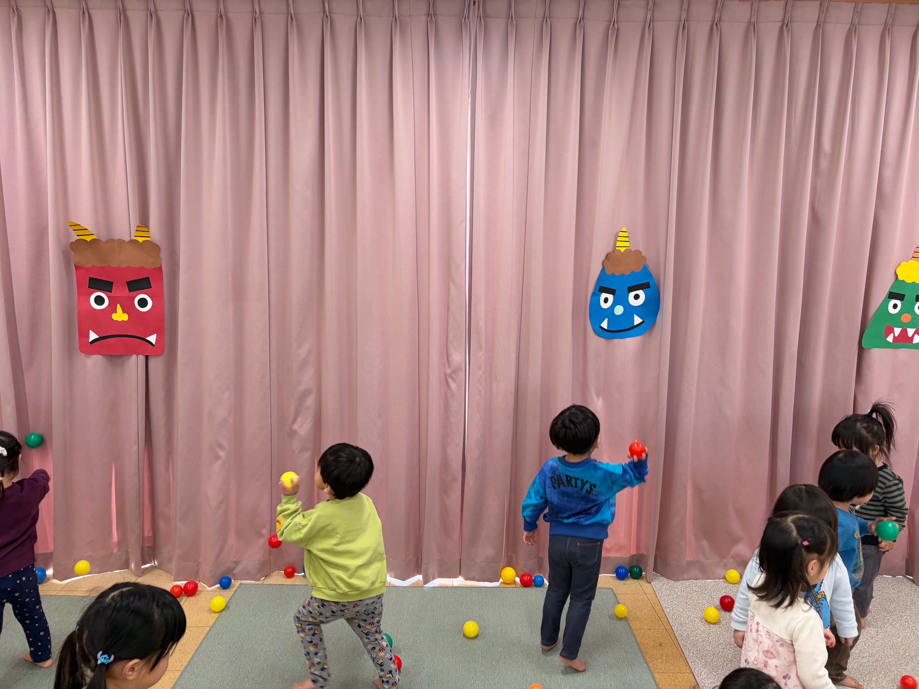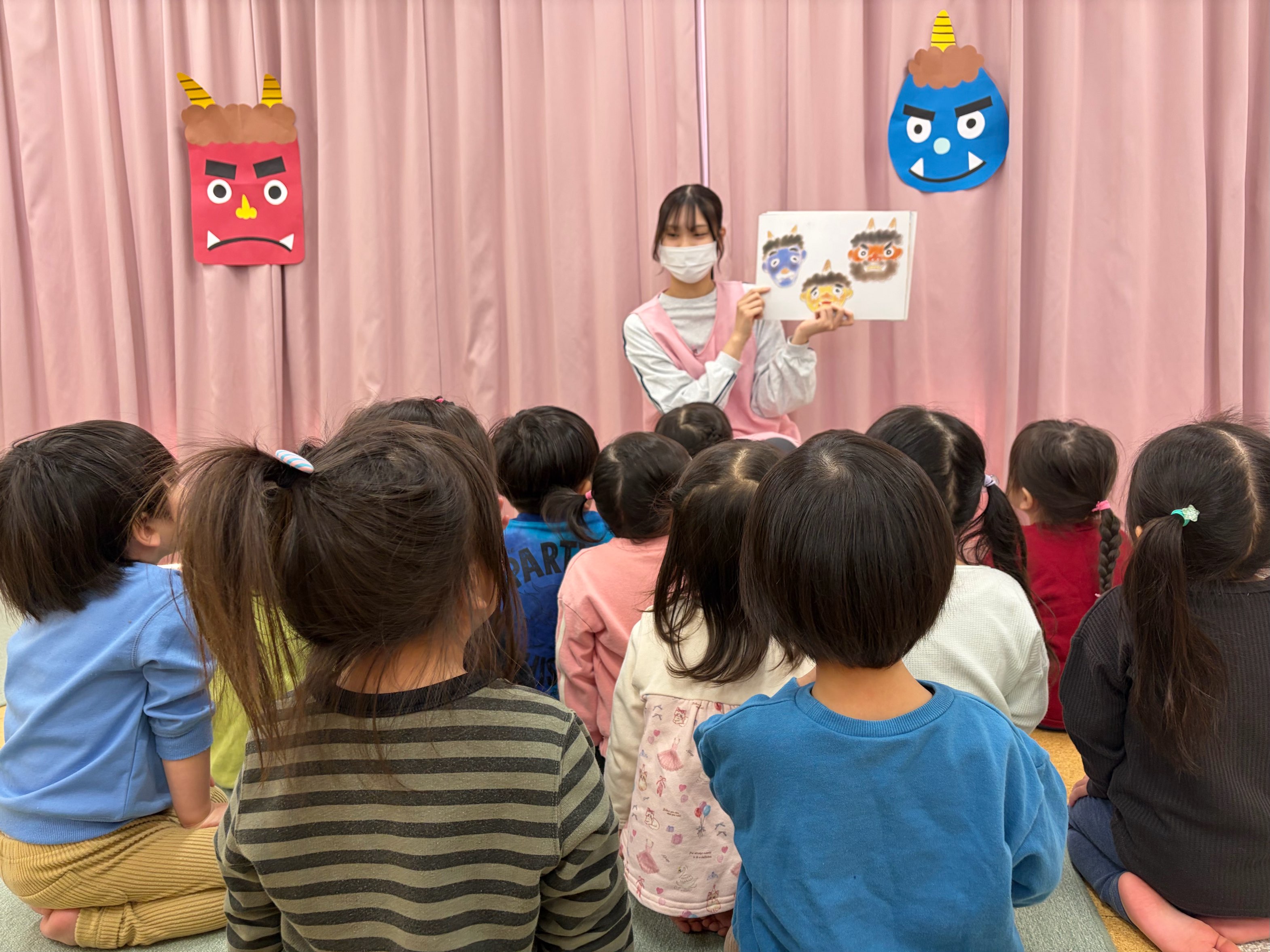 2月3日(火)に節分の会を行いました。節分にちなんだ紙芝居を見たり、豆まきの歌を歌ったりして節分の雰囲気を味わうことができました。鬼の登場にドキドキしながらも、「鬼は外-!福は内ー!」と元気に声を上げて、鬼退治を頑張る子どもたちでした!✨