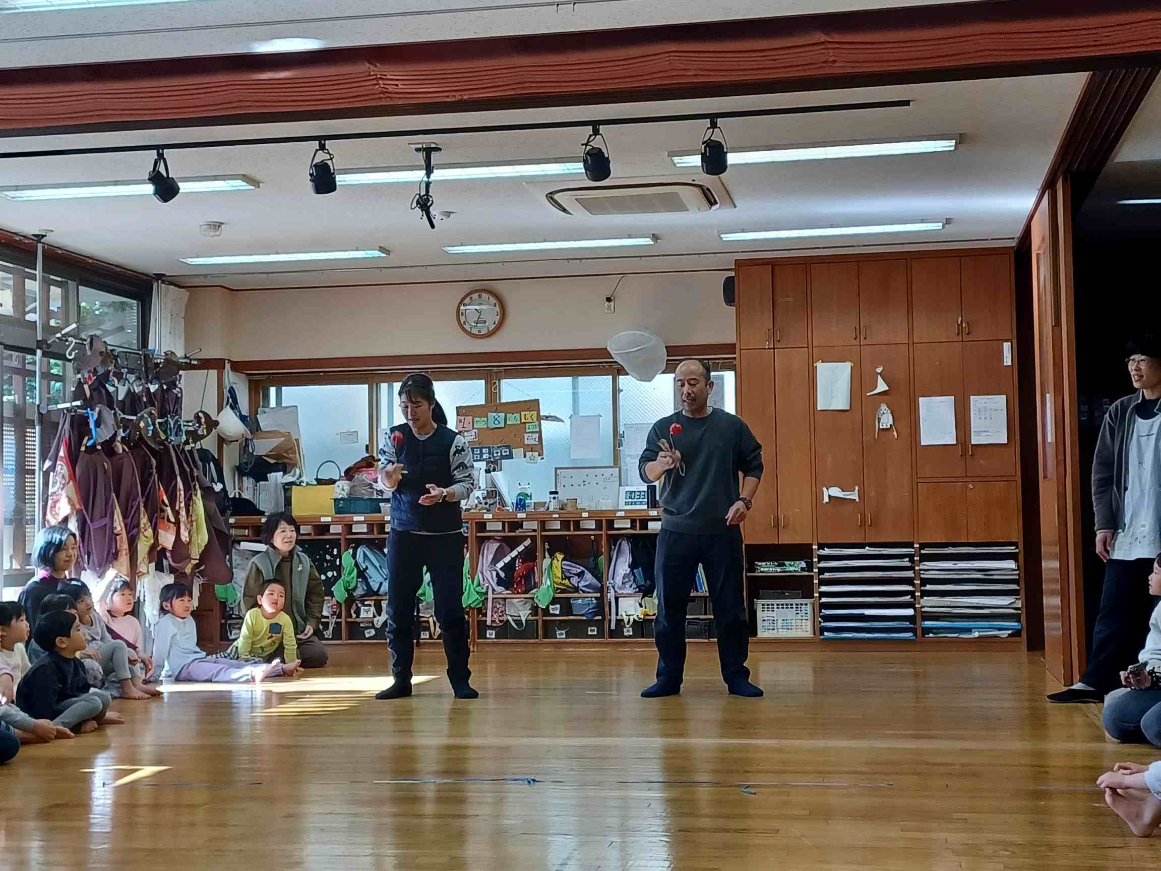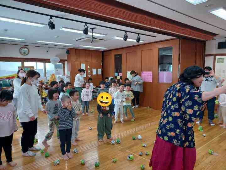 「あけましておめでとうございます。ほんねんもよろしくおねがいします。」と子どもたちと、新年の挨拶をして会がはじまりました。お祝いの職員寸劇「12支のお話」を見て干支の知ったり、手遊び、お手玉、けんだま、コマ遊びの名人の披露を見ました。その後、名人めざして遊ぶ姿がありました。