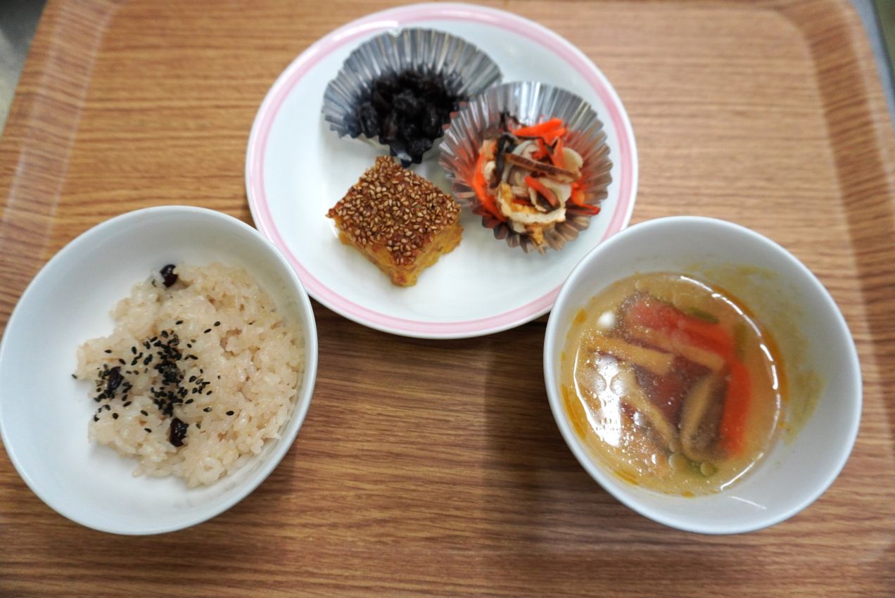 今日の給食は“おせち料理”でした。(お赤飯・松風焼き・黒豆・七福なます・八杯汁)