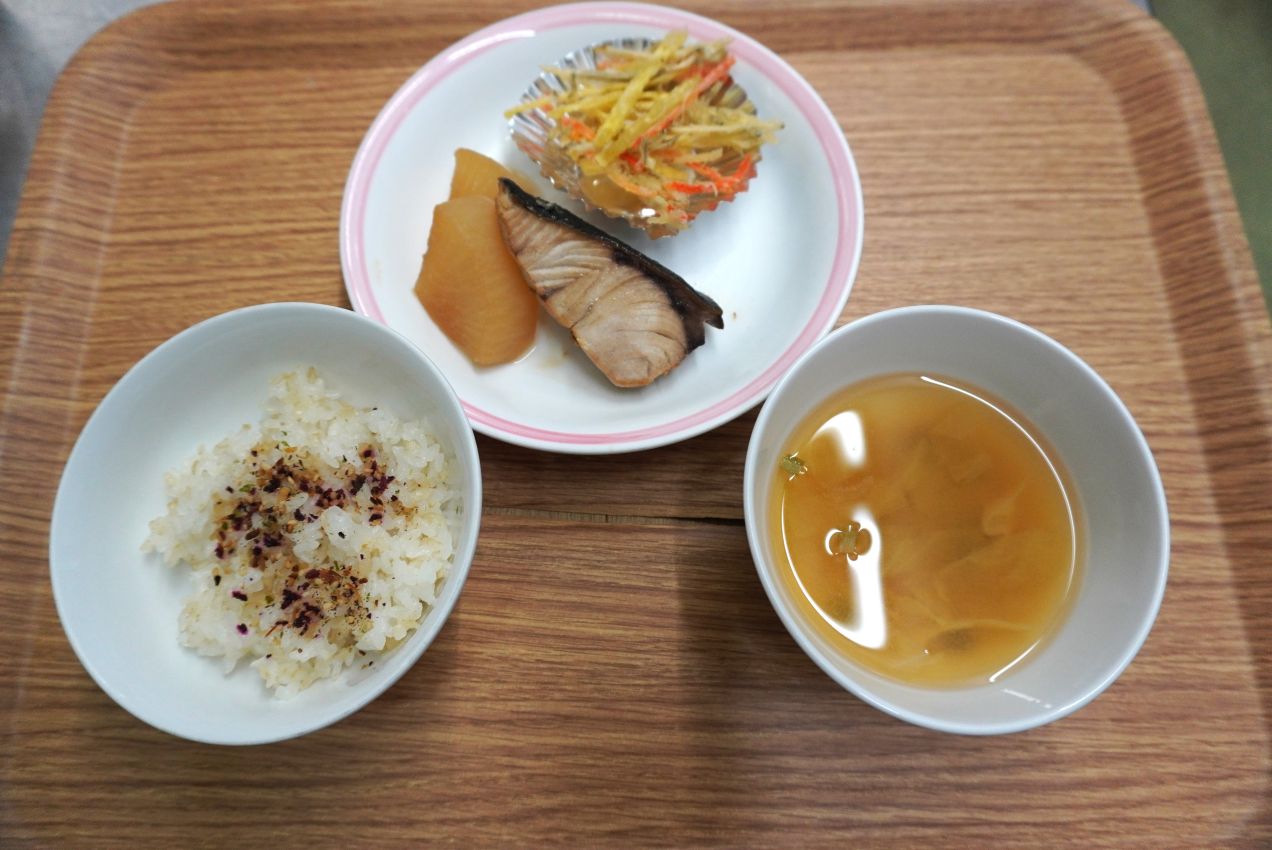 メニューは【ふりかけごはん(玄米入り)、ぶり大根、舞茸のかきあげ、みそ汁】でした。