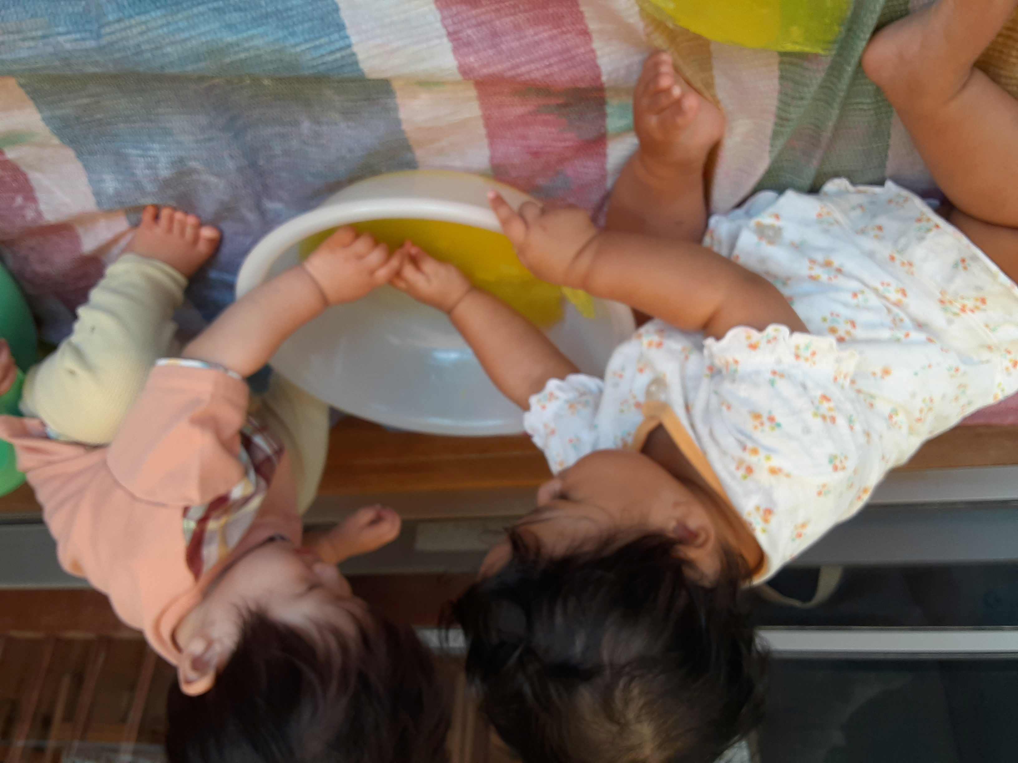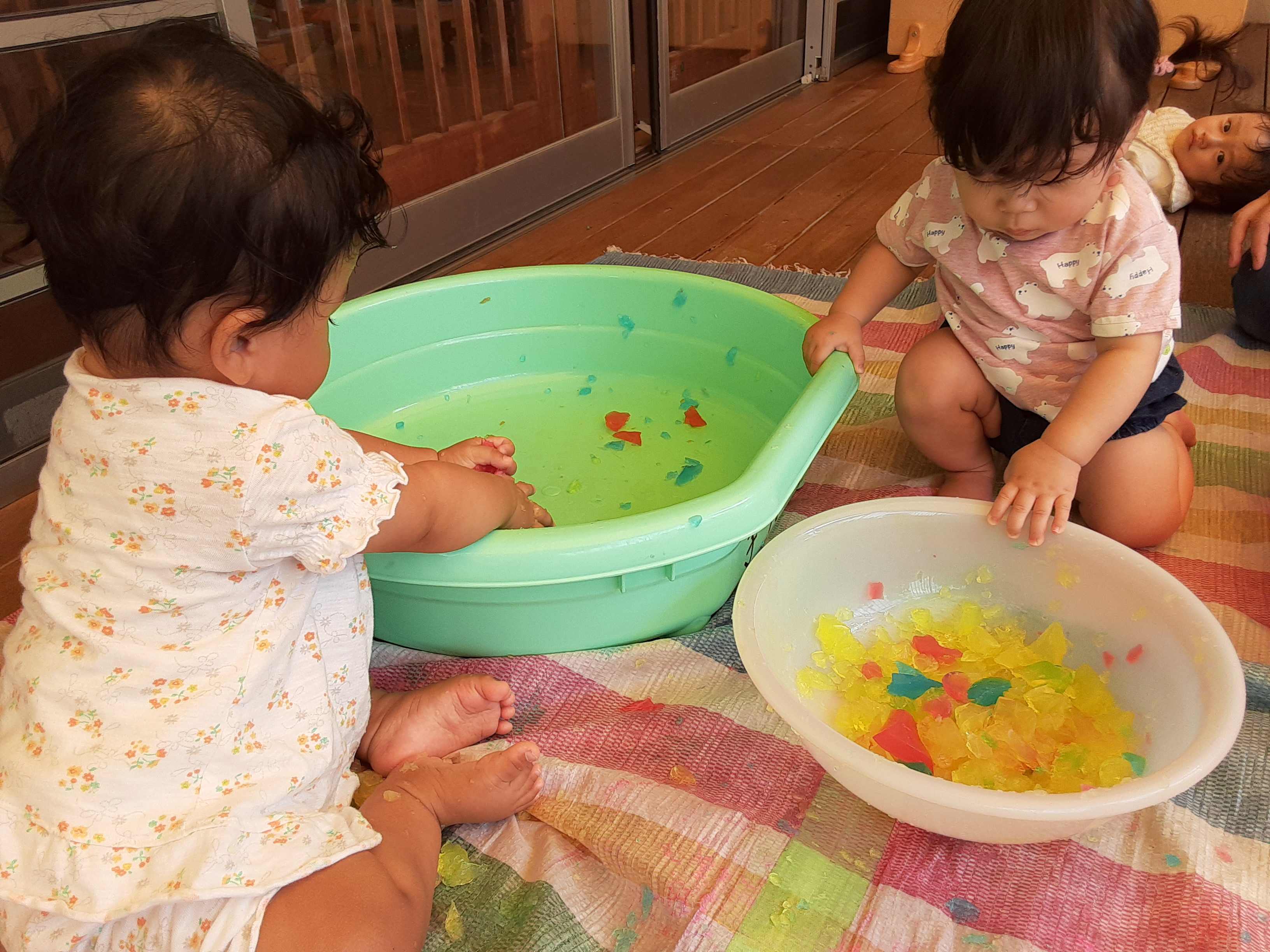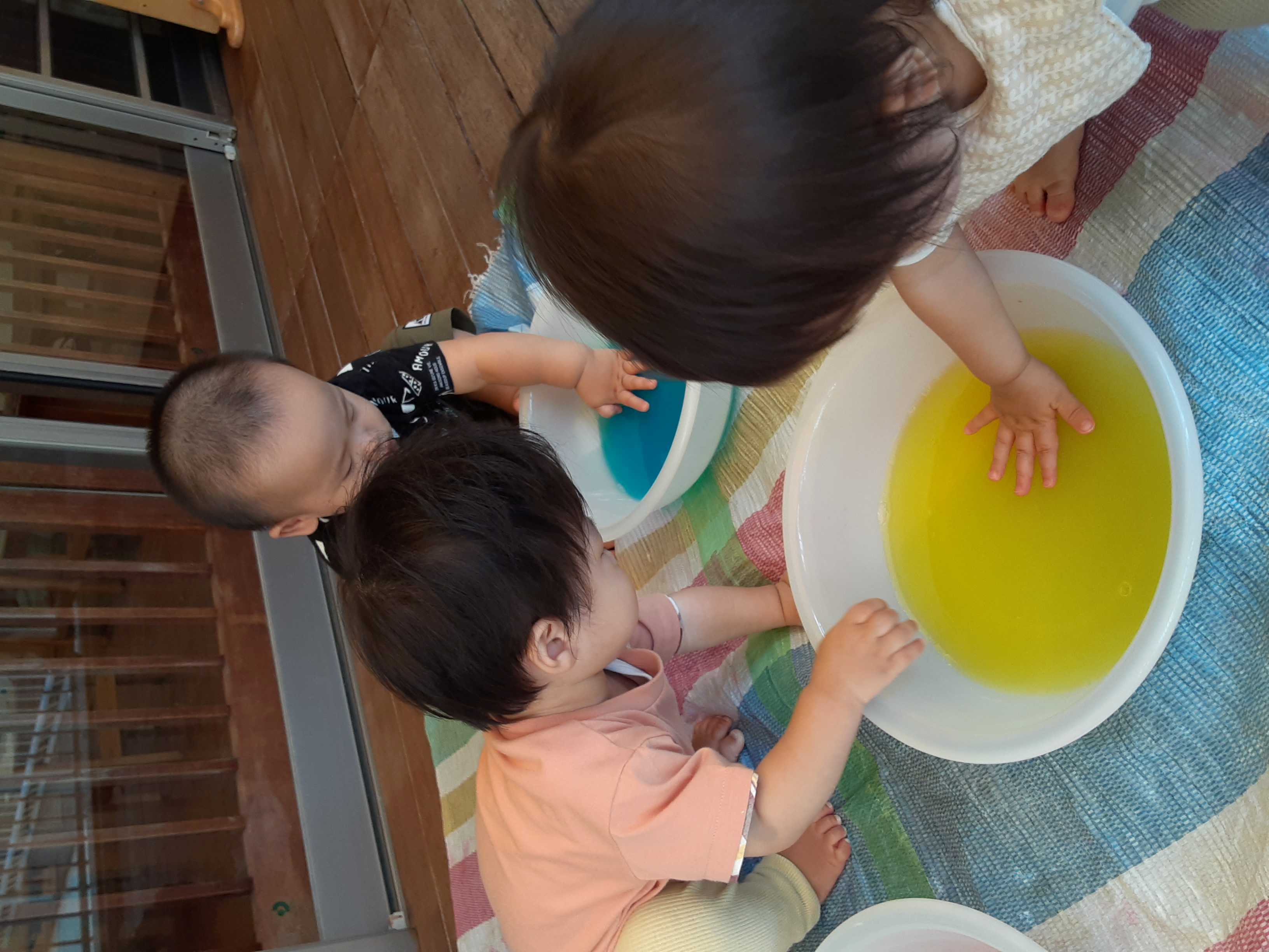 夏に寒天の感触遊びをしました。ベランダにシートを敷いて寒天を置くとすぐに集まってきた子どもたち。“なんだろう”と手に触れ、ぺちぺちと寒天を叩いていました。ぐにゅっとする感覚が面白いのか小さくなるまでぐにゅぐにゅとしたり、寒天をちぎって桶に入れたり、楽しみ方も色々でした。