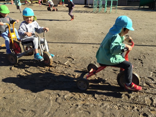 園庭の地面も凍り、お日様が当たり溶けたところが泥沼に…三輪車で行けるかなぁ。などいろいろチャレンジしていました。